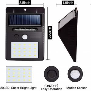 - Ultra-bright: 20 powerful leds and the motion angle is 120 degrees which can provide excellent illumination. It’s a perfect choice to be used in garden, yard, driveway, stairs, outside wall etc