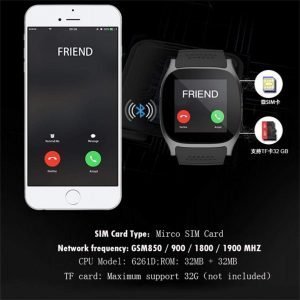 - Smart Features – Call Functions: GSM/GPRS 850/900/1800/1900 || Messaging : SMS and Receive SMS Notification by bluetooth (Only android) || Entertainment : MP3, AVI; bluetooth music playing || Pedometer : Movement step record || Sedentary remind, Sleep monitoring, Taking pictures || Others: Alarm clock, calendar, Calculators etc. || Bluetooth push message (Only for android phone): WeChat, Whatsapp, Facebook, Timely information etc.